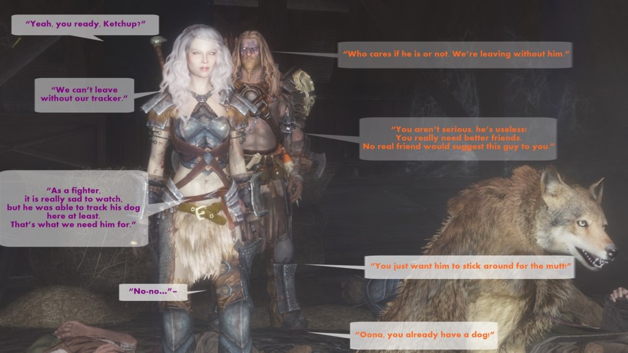 “Yeah, you ready, Ketchup?” – Oona “Who cares if he is or not. We’re leaving without him.” – Othor “We can’t leave without our tracker.” – Oona “You aren’t serious, he’s useless! You really need better friends. No real friend would suggest this guy to you.” – Othor “As a fighter, it is really sad to watch, but he was able to track his dog here at least. That’s what we need him for.” – Oona “You just want him to stick around for the mutt!” – Othor “No-no…”– Oona “Oona, you already have a dog!” – Othor