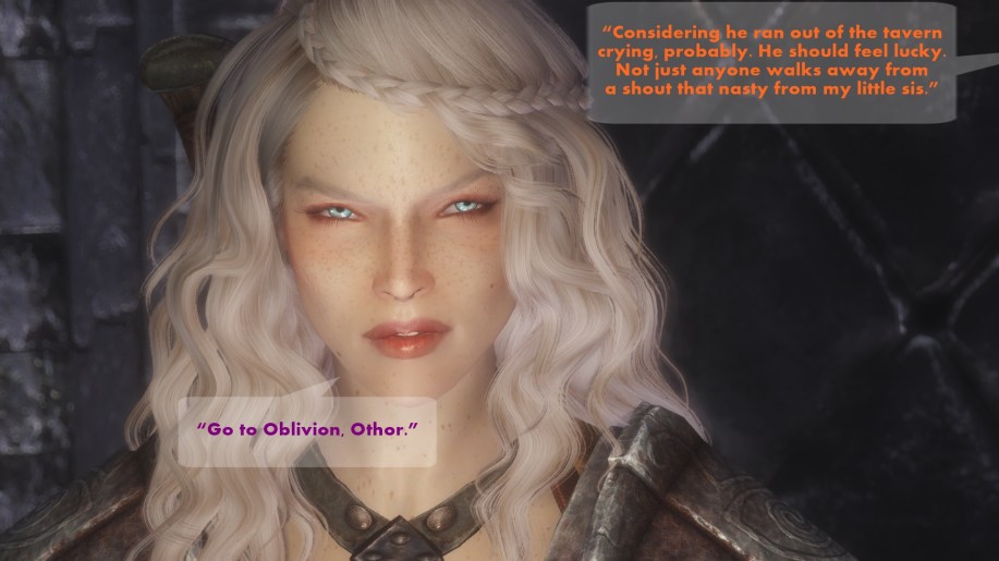 “Considering he ran out of the tavern crying, probably. He should feel lucky. Not just anyone walks away from a shout that nasty from my little sis.” – Othor “Go to Oblivion, Othor.” – Oona