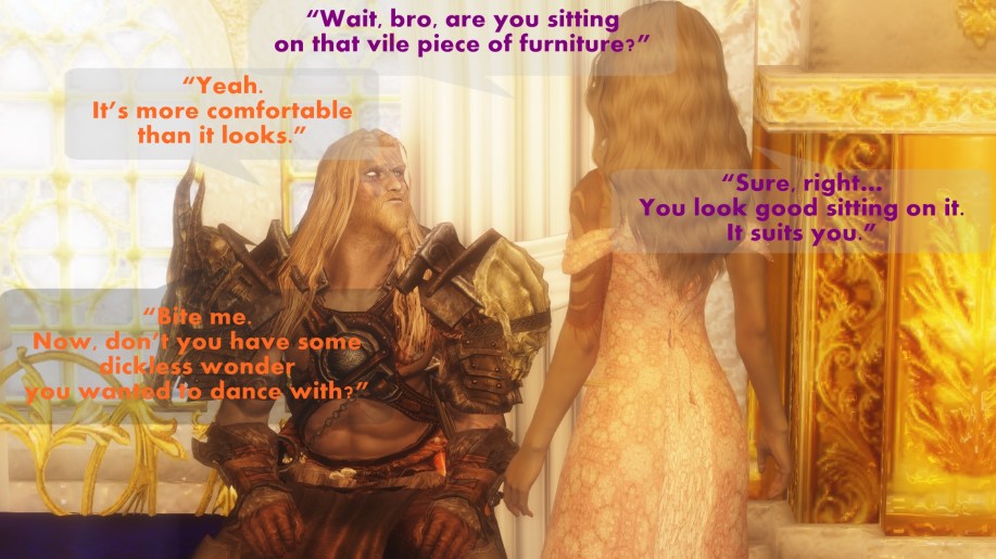 “Wait, bro, are you sitting on that vile piece of furniture?” – Oona “Yeah. It’s more comfortable than it looks.” – Othor “Sure, right… You look good sitting on it. It suits you.” – Oona “Bite me. Now, don’t you have some dickless wonder you wanted to dance with?” – Othor